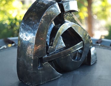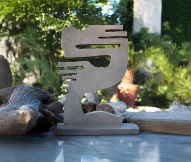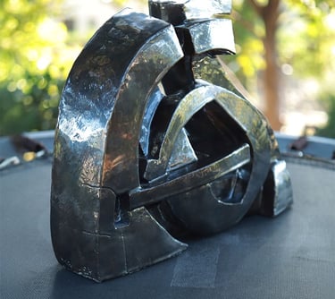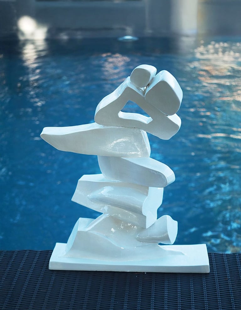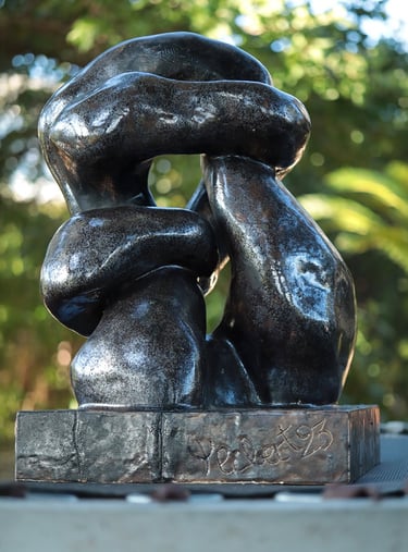 Née du geste de la houle, Circonvolutions enroule deux masses comme des galets polis qui se répondent. La forme cherche le passage puis l’étreinte : courbes continues, peau sombre, reflets qui glissent comme l’eau sur la pierre. Les volumes se plient et se relancent à la manière des pierres roulées par le ressac.