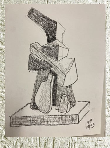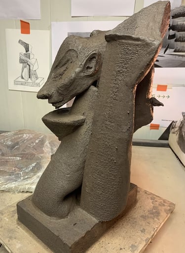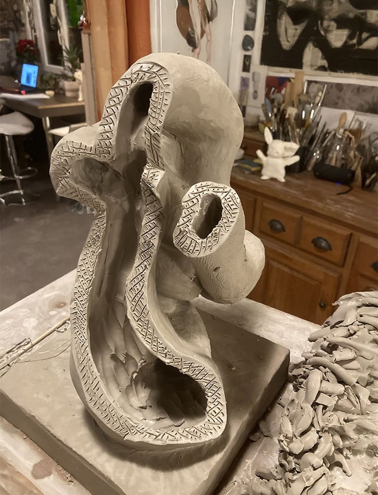 La pièce est modelée dans la masse d'argile en cherchant une dynamique, un élan, un parcours, des passages de lumières.... La forme cherche sa place.